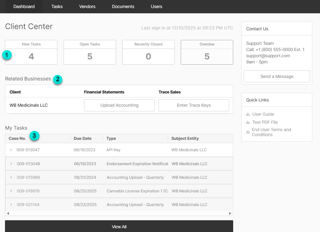 Upon logging in, you will see the Dashboard. The dashboard provides an overview of all information for all companies that you have access to. The words in the top colored banner of the page indicate the different pages you may navigate to: Tasks, Vendors (If applicable), Documents and Users.