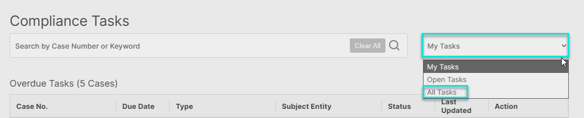 To display all tasks ever assigned to you from the View All Page, select the "My Tasks" dropdown and select "All Tasks"